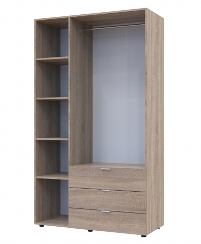шафа містить три відділення: відділення з трьома висувними шухлядами, відділення з полицями та відділення зі штангою для вішалок |