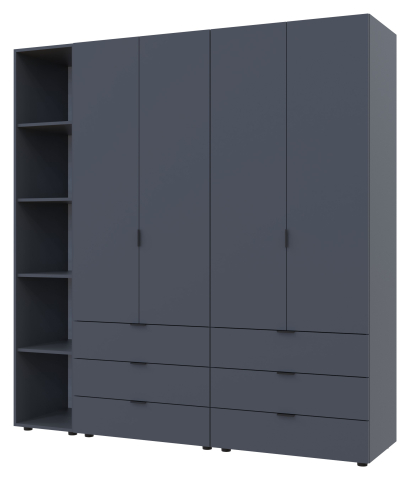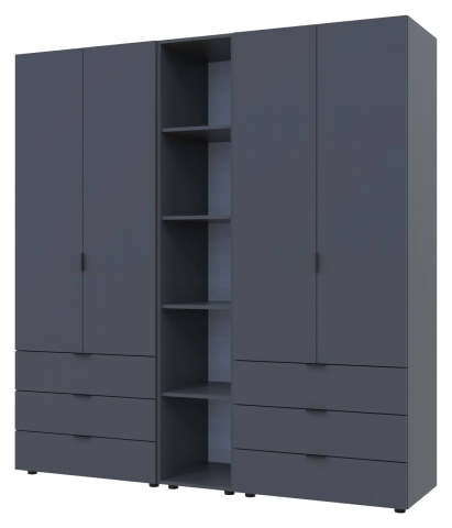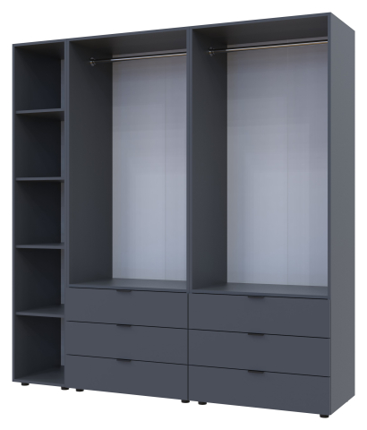 шафа містить п’ять відділень: два відділення з трьома висувними шухлядами, два відділення зі штангою для вішалок та одне відділення з відритими полицями |