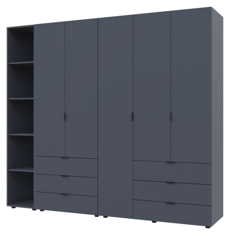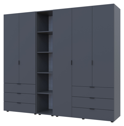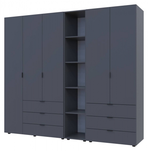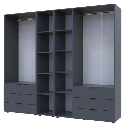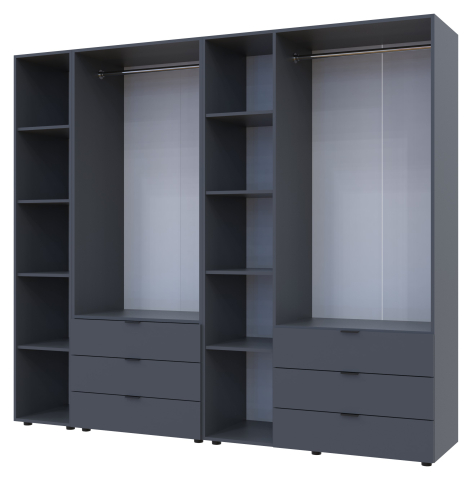 шафа містить шість відділень: два відділення з трьома висувними шухлядами, відділення з закритими полицями, два відділення зі штангою для вішалок та одне відділення з відритими полицями |