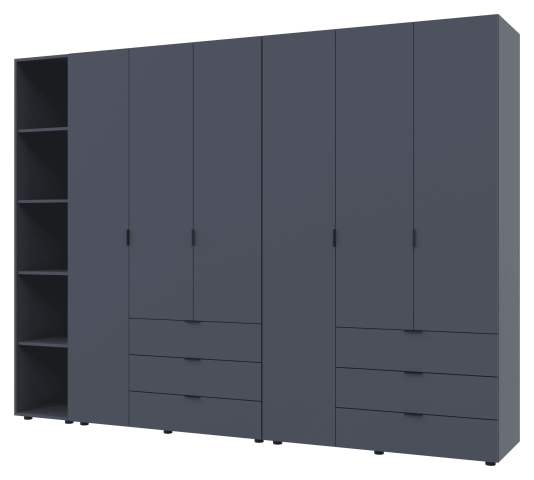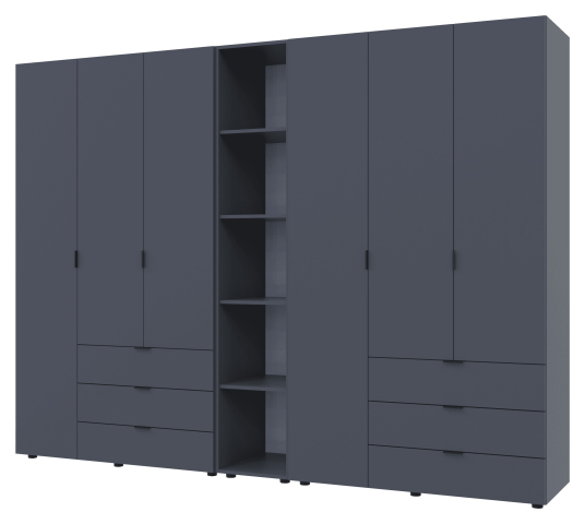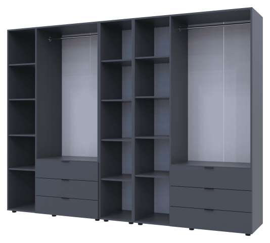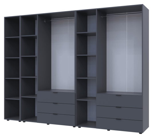 шафа містить сім відділень: два відділення з трьома висувними шухлядами, два відділення з закритими полицями, два відділення зі штангою для вішалок та одне відділення з відритими полицями |