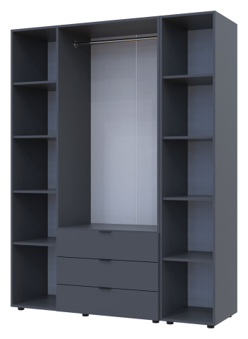 шафа містить чотири відділення: відділення з трьома висувними шухлядами, відділення з закритими полицями, відділення зі штангою для вішалок та одне відділення з відритими полицями |