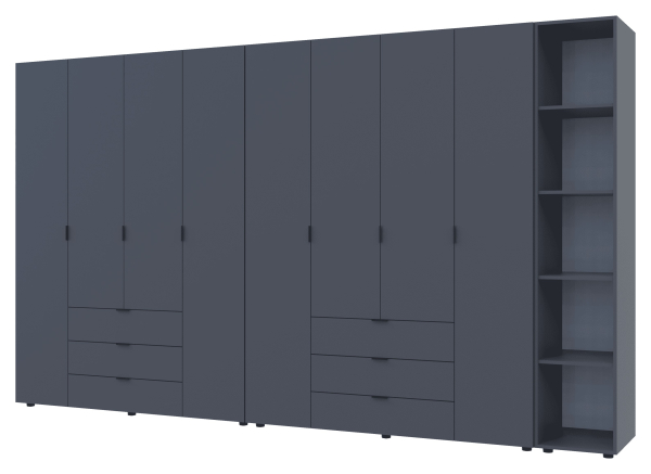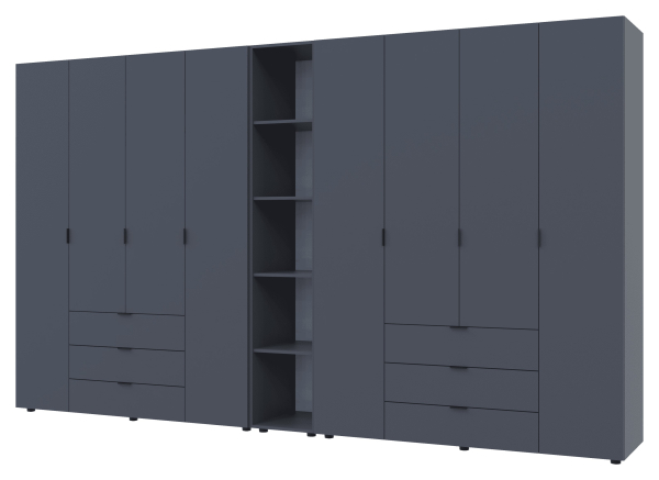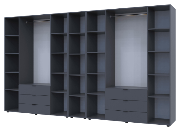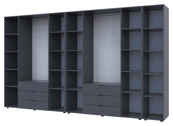 шафа містить дев’ять відділень: два відділення з трьома висувними шухлядами, чотири відділення з закритими полицями, два відділення зі штангою для вішалок та одне відділення з відритими полицями |