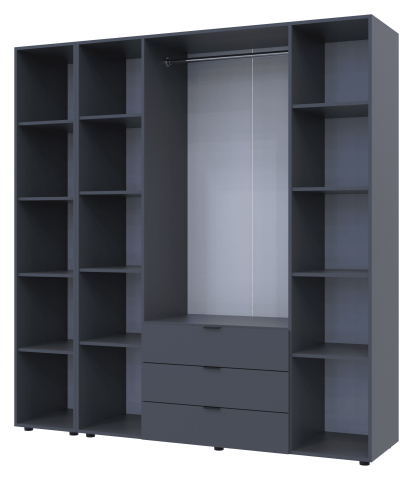 шафа містить п’ять відділення: відділення з трьома висувними шухлядами, два відділення з закритими полицями, відділення зі штангою для вішалок та одне відділення з відритими полицями |