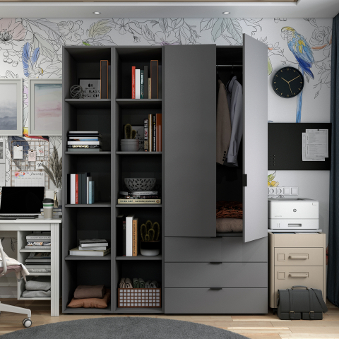 шафа містить чотири відділення: відділення з трьома висувними шухлядами, відділення зі штангою для вішалок та два відділення з відритими полицями |