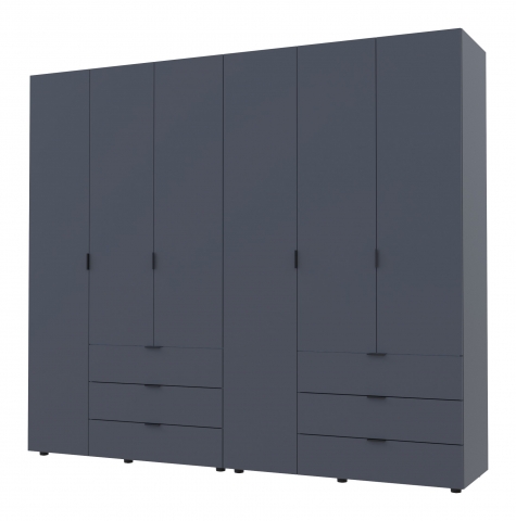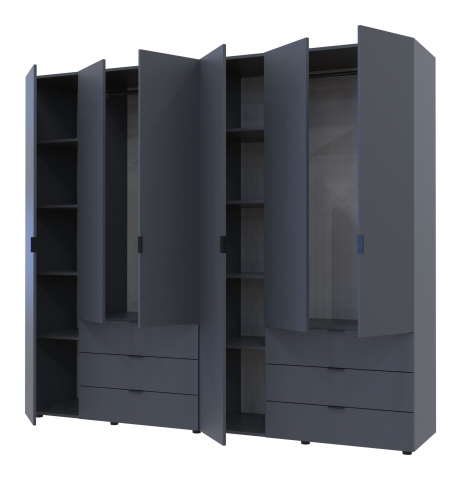шафа містить шість відділень: два відділення з трьома висувними шухлядами, два відділення з полицями та два відділення зі штангою для вішалок |