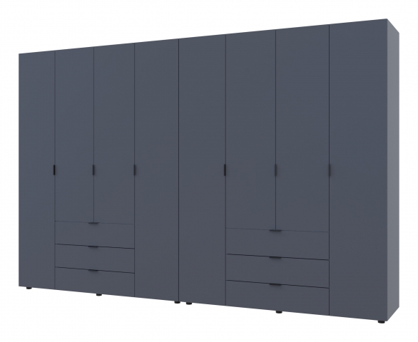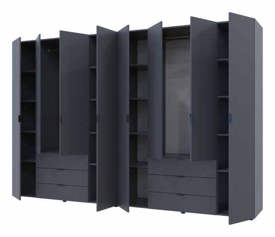 шафа містить вісім відділень: два відділення з трьома висувними шухлядами, чотири відділення з полицями та два відділення зі штангою для вішалок |