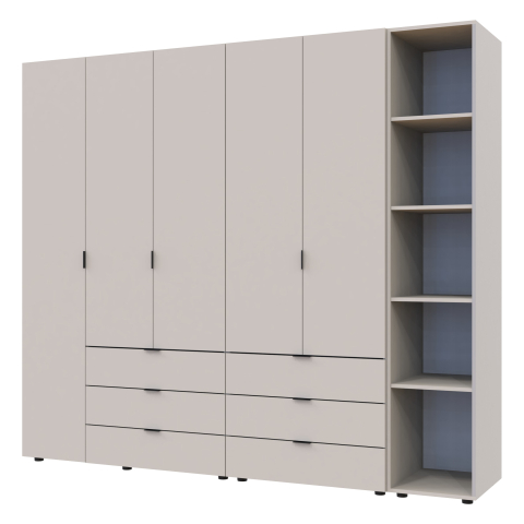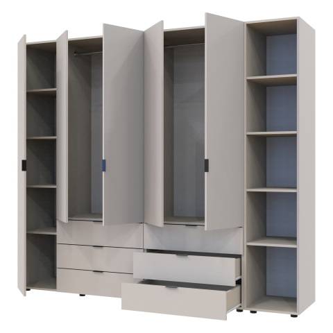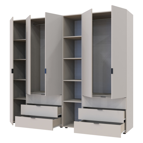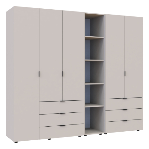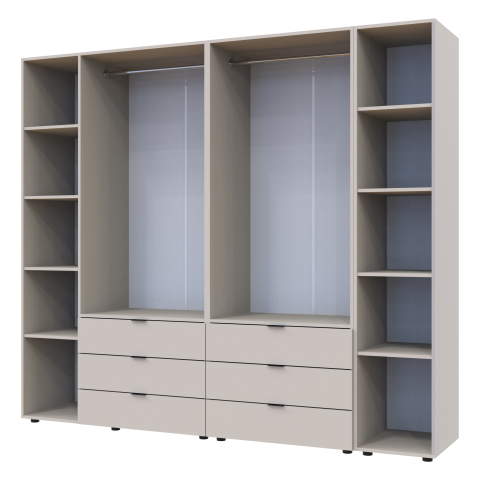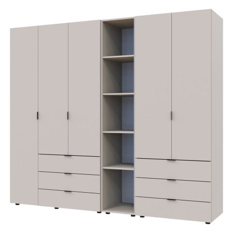 шафа містить шість відділень: два відділення з трьома висувними шухлядами, відділення з закритими полицями, два відділення зі штангою для вішалок та одне відділення з відритими полицями |