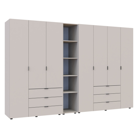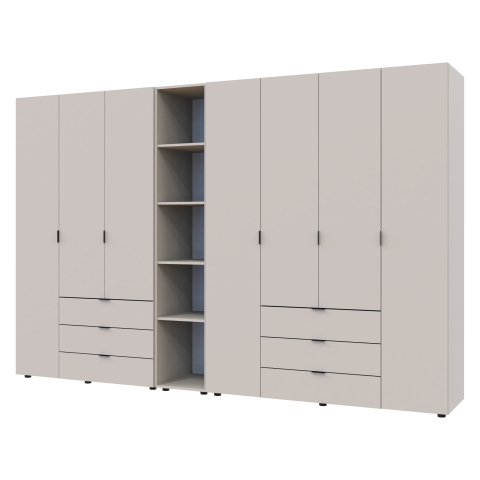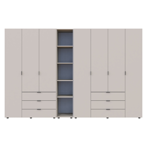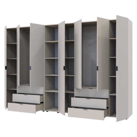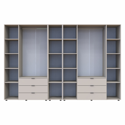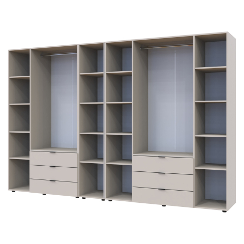 шафа містить вісім відділень: два відділення з трьома висувними шухлядами, три відділення з закритими полицями, два відділення зі штангою для вішалок та одне відділення з відритими полицями |
