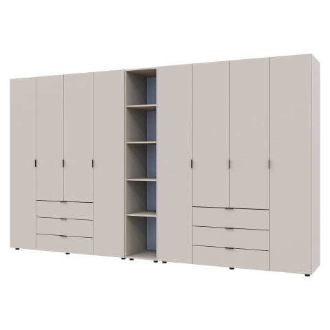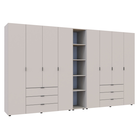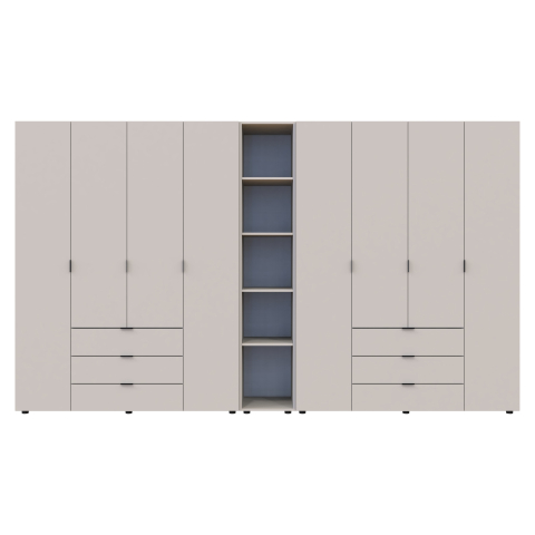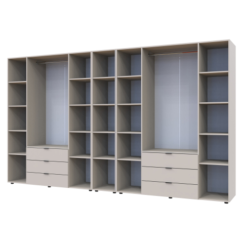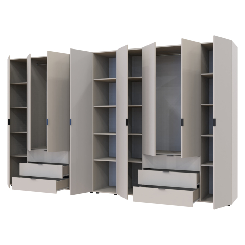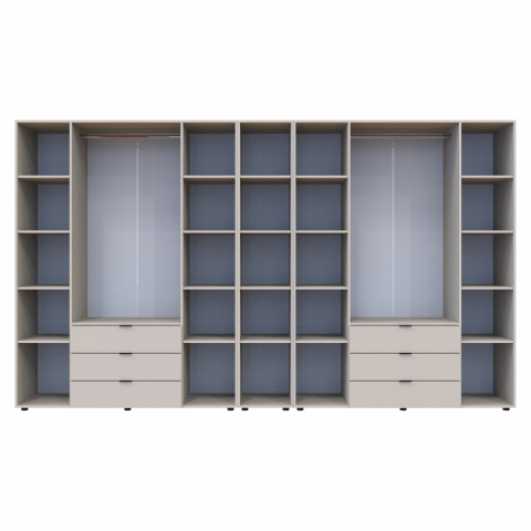 шафа містить дев’ять відділень: два відділення з трьома висувними шухлядами, чотири відділення з закритими полицями, два відділення зі штангою для вішалок та одне відділення з відритими полицями |