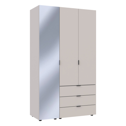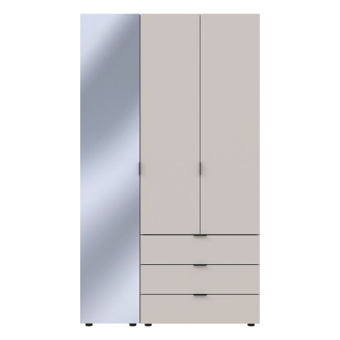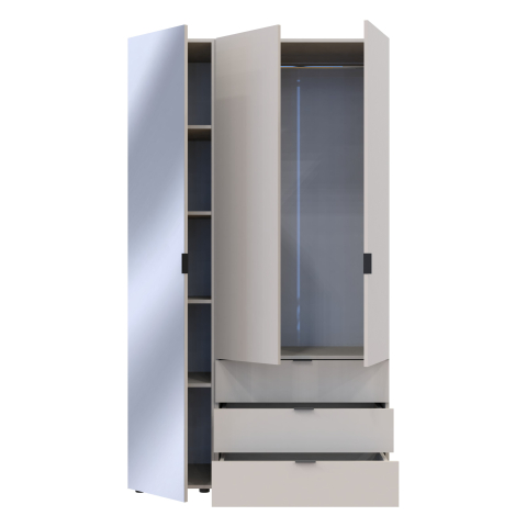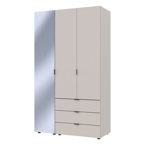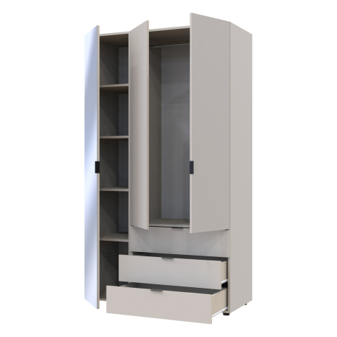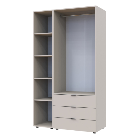 шафа містить три відділення: відділення з трьома висувними шухлядами, відділення зі штангою для вішалок та відділення з полицями |