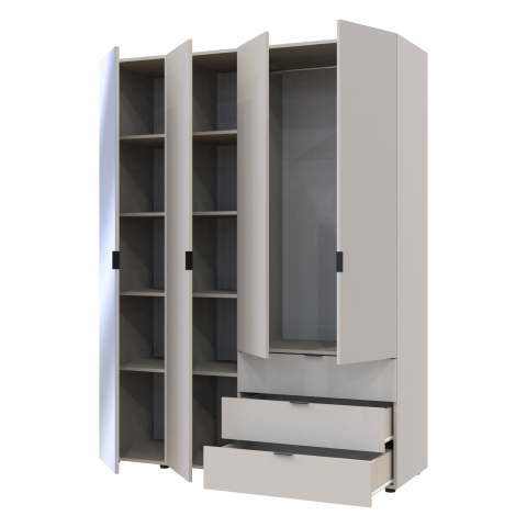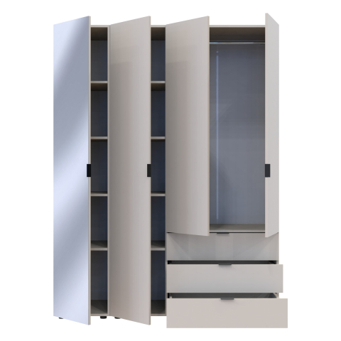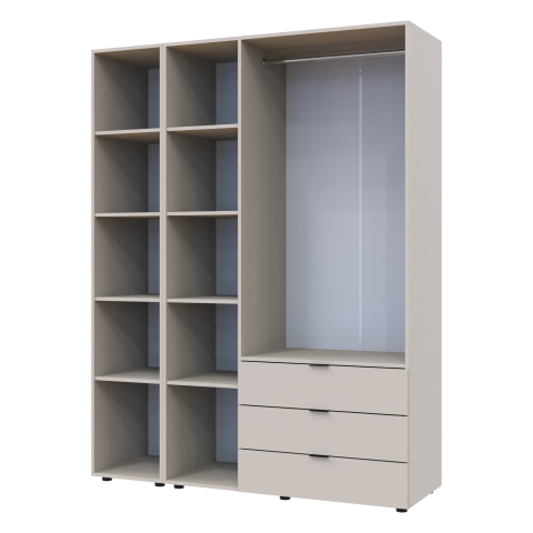 шафа містить чотири відділення: відділення з трьома висувними шухлядами, відділення зі штангою для вішалок та два відділення з полицями |