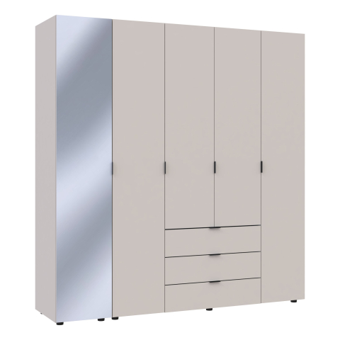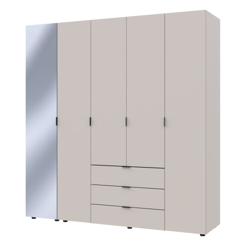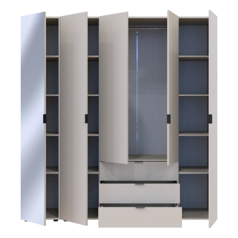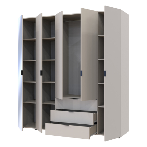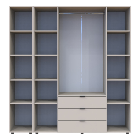 шафа містить п’ять відділень: відділення з трьома висувними шухлядами, відділення зі штангою для вішалок та три відділення з полицями |