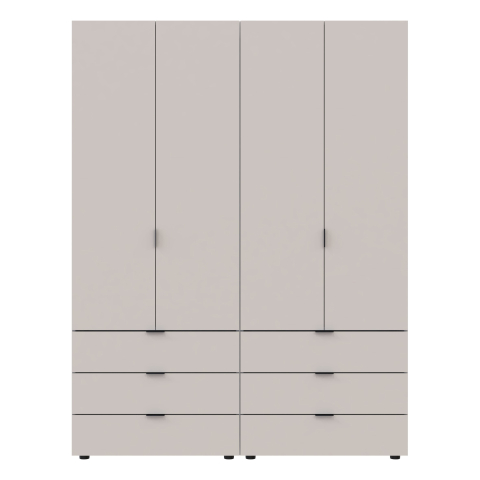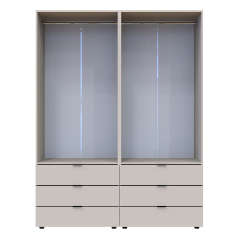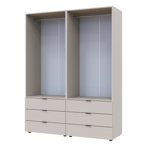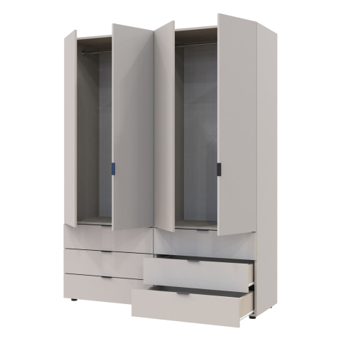 шафа містить чотири відділення: два відділення з трьома висувними шухлядами та два відділення зі штангою для вішалок |