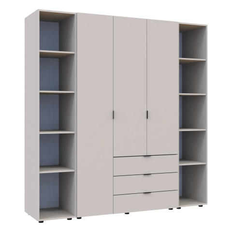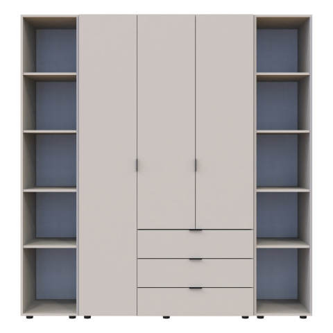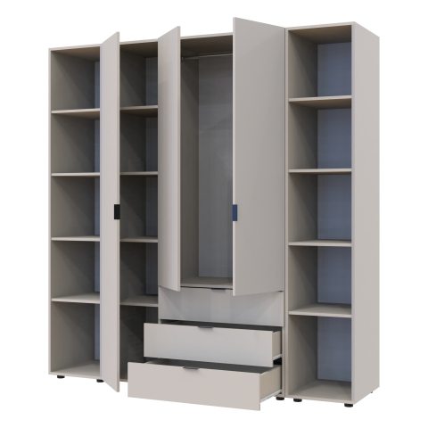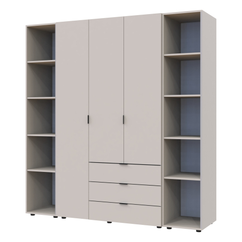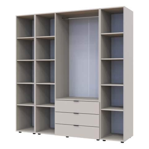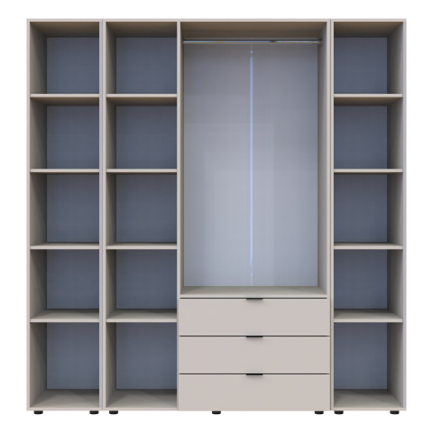 шафа містить п’ять відділень: відділення з трьома висувними шухлядами, відділення зі штангою для вішалок та три відділення з полицями |