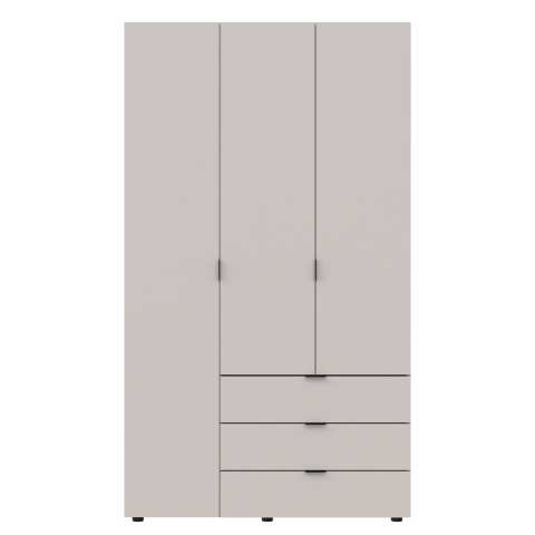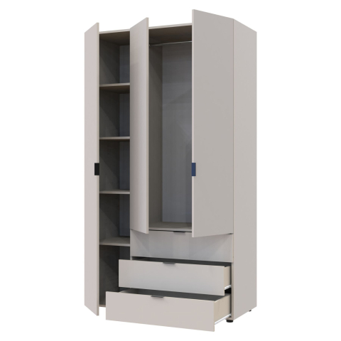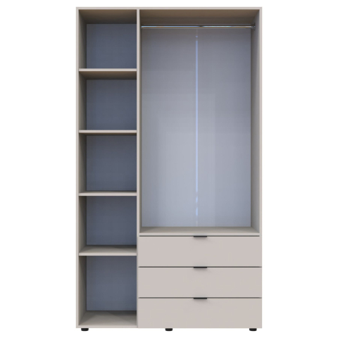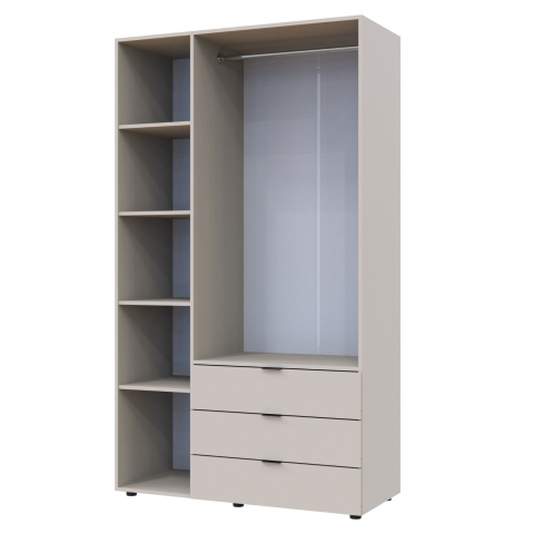 шафа містить три відділення: відділення з трьома висувними шухлядами, відділення з полицями та відділення зі штангою для вішалок |