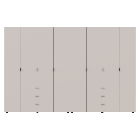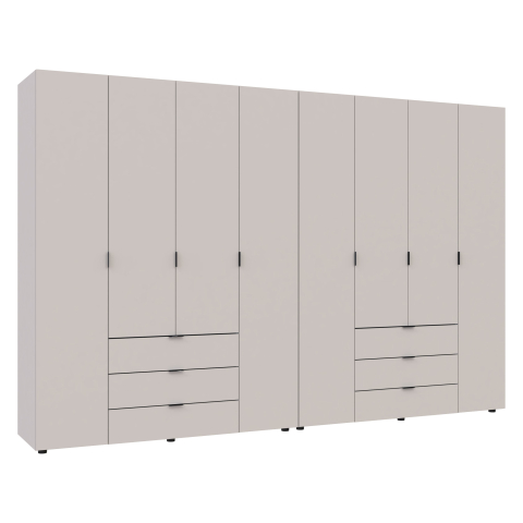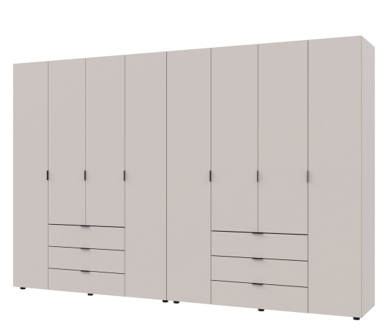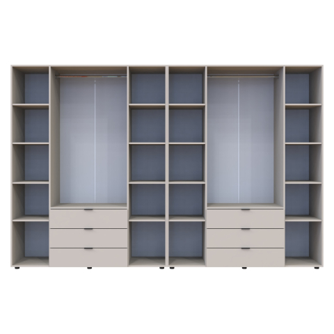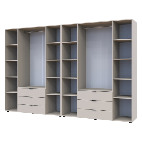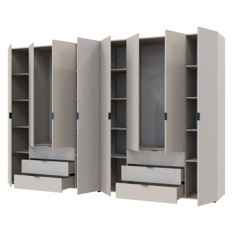 шафа містить вісім відділень: два відділення з трьома висувними шухлядами, чотири відділення з полицями та два відділення зі штангою для вішалок |
