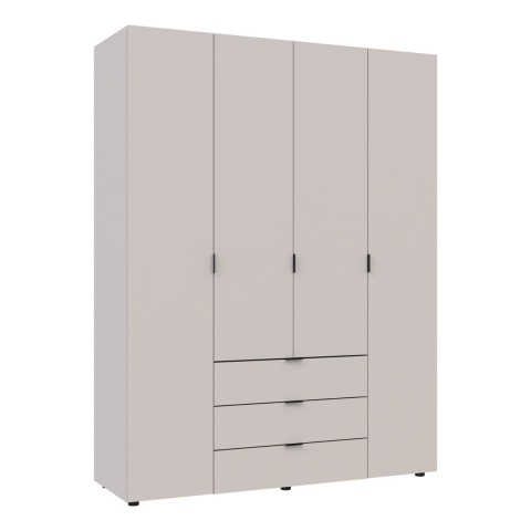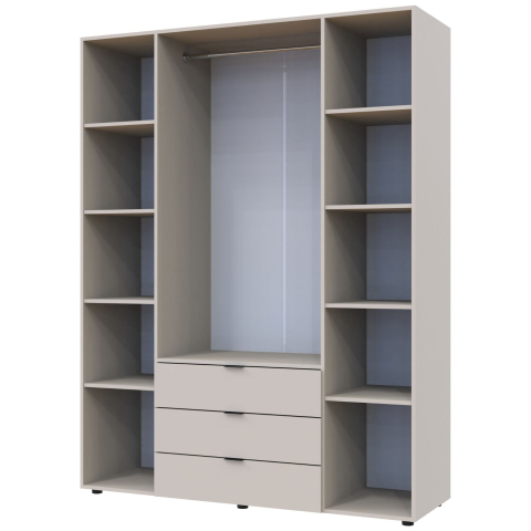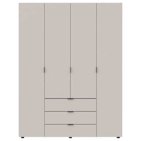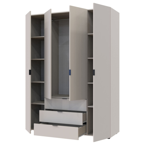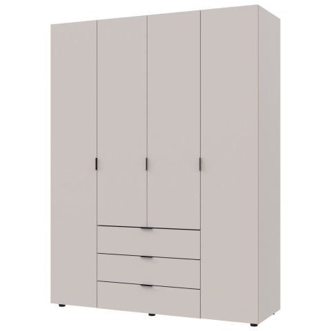 шафа містить чотири відділення: відділення з трьома висувними шухлядами, два відділення з полицями та одне відділення зі штангою для вішалок |