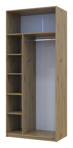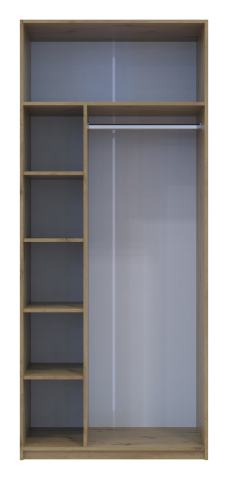 шафа містить два відділення - відділення з полицями та відділення зі штангою для вішалок, зверху розташована полиця антресоль |