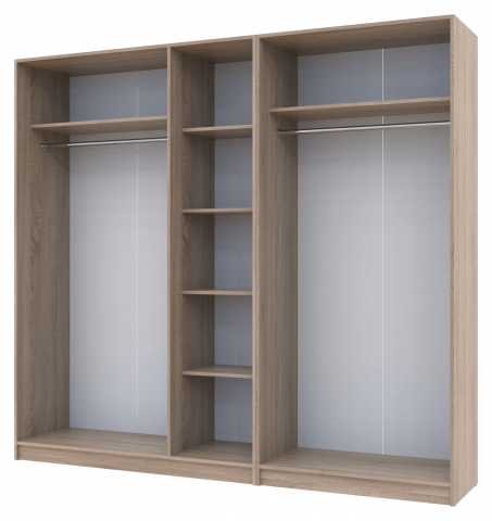 шафа містить три відділення: відділення з полицями та два відділення зі штангою для вішалок, зверху полиці антресоль |