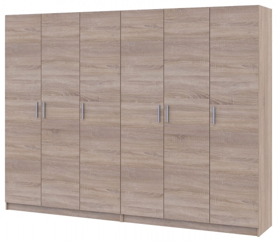Сучасна платтяна шафа Promo Doros з шістьма дверцятами та чотирма відділеннями: два відділення з полицями та два відділення зі штангою для вішалок, зверху полиці антресоль. За допомогою шафи Promo Doros Ви забезпечите порядок та затишок у вашому приміщенні.