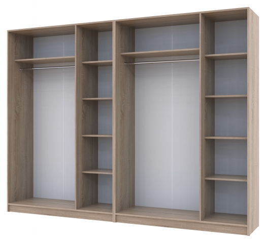 шафа містить чотири відділення: два відділення з полицями та два відділення зі штангою для вішалок, зверху полиці антресоль |
