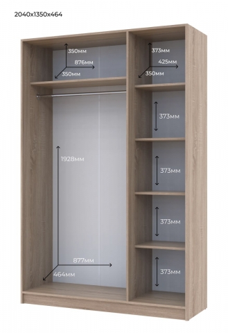 шафа містить два відділення: відділення з полицями та відділення зі штангою для вішалок, зверху полиця антресоль |