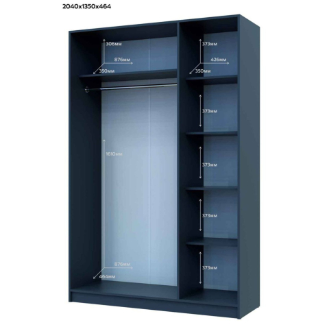 шафа містить два відділення: відділення з полицями та відділення зі штангою для вішалок, зверху полиця антресоль |