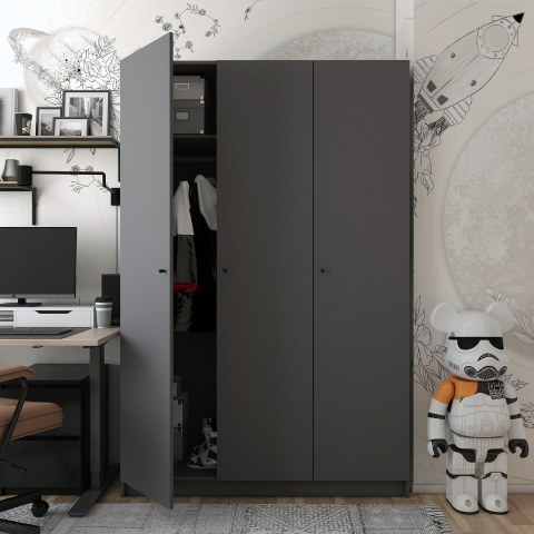Сучасна платтяна шафа Promo Doros з трьома дверцятами та двома відділеннями для одягу: відділення з полицями та відділення зі штангою для вішалок, а також з антресольною полицею для розміщення предметів, що рідко використовуються, сезонного одягу, ковдр тощо. За допомогою шафи Promo Doros Ви забезпечите порядок та затишок у вашому приміщенні.