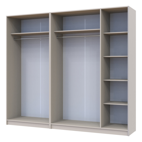 шафа містить три відділення: відділення з полицями та два відділення зі штангою для вішалок, зверху полиці антресоль |