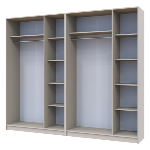 шафа містить чотири відділення: два відділення з полицями та два відділення зі штангою для вішалок, зверху полиці антресоль |
