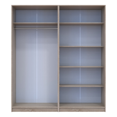 шафа містить два закриті відділення: одне відділення зі штангою для вішалок, зверху полиці антресоль, друге відділення з рядом зручних містких полиць |