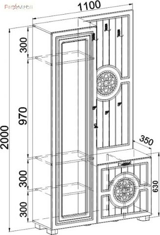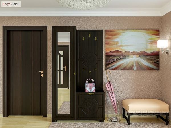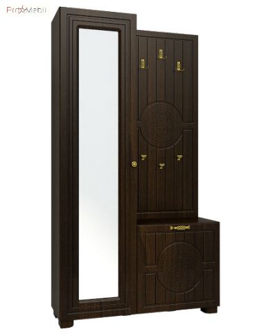 Містка шафа і в той же час сучасний передпокій суцільної конструкції, яка складається з 1 елемента і включає в себе однокамерну шафу з дзеркалом, відкритий вішак і тумбу для взуття. Шафа розташована з лівого боку і має одні дверцята, всередині розташовано три полиці і тремпель для вішалок. Відкритий вішак c трьома гачками. Тумба для взуття, яка розділена на дві частини, в одній з яких є полиця. Корпус виготовляється з ламінованої ДСП товщиною 16 мм німецького концерну «Kronospan», фасад - з МДФ з технологією нанесення об'ємного малюнка 3D. Торці деталей обклеюються кромкою ПВХ фірми Rehau. Меблі Moblan Santi випускаються в насиченому кольорі «горіх темний» зі структурою деревини. Головною особливістю колекції є - рамкові фасади з вишуканим фрезеруванням і з ажурними медальйонами посередині, металева фурнітура, виконана в стилі старовинного кування в золотистому кольорі, елегантні ніжки додають легкості. Всі елементи продумані до дрібниць дозволяють формувати унікальний меблевий комплект, який ідеально підійде для Вашого передпокою.