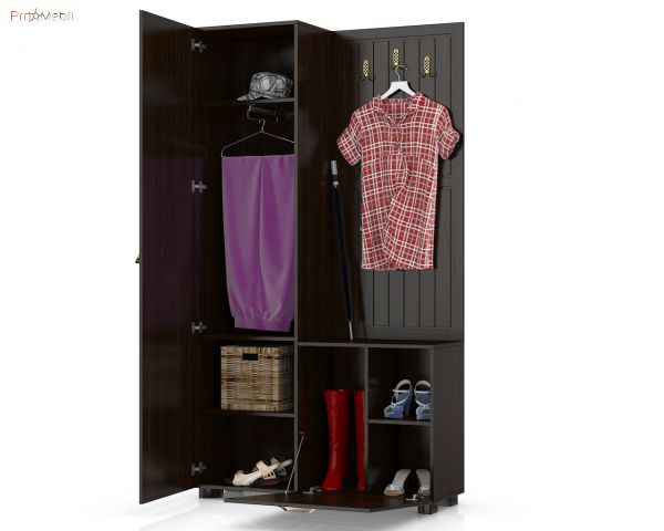 цілісна конструкція, складається з однодверної шафи з дзеркалом, відкритого вішака і тумби для взуття |