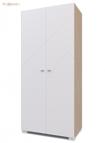 Дводверна шафа Х-02 X-Скаут Санті зі штангою для вішалок і полицями в вітальню, підліткову кімнату, передпокою або спальню. Містка і функціональна шафа для зберігання одягу та речей. Корпус виготовляється з високоякісного ламінованого ДСП товщиною 18 мм німецького концерну «Kronospan», фасади - МДФ c фрезеруванням товщиною 16 мм виробництва Італія. Торці деталей обклеюються кромкою ПВХ фірми Rehau. Меблі X-Скаут Santi випускаються в гармонійному поєднанні білих матових фасадів з дубовим відтінком корпусу дуб кам’яний. Характерними особливостями меблів X-Skaut Santi є сучасний дизайн, прості геометричні форми модулів, елегантне фрезерування на фасадах, стильні довгасті пластикові ручки, фірмові комплектуючі. Меблі X-Скаут Санті дозволять створити максимально практичний та комфортний інтер'єр і зроблять його яскравим, стильним і неповторним.