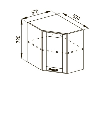 Навісна шафка В57x57 (h-720) кухня Домініка Світ Меблів елемент верхнього ярусу модульної кухні, який вигідно організує навіть невеликий простір і максимально оптимізує простір, раціонально допоможе використовувати важкодоступні ділянки кухонної зони і чудово підійде для зберігання предметів, доступ до яких повинен бути максимально швидким і зручним. Шафка верхня кутова містить одне закрите відділення з полицею всередині, оптимальний вибір для тих, кому потрібно багато місця для зберігання всього, що може знадобитися в процесі приготування. Корпус виготовляється з якісного ламінованого ДСП у популярних кольорових рішеннях на вибір «білий», «дуб сонома», «графіт», «попелястий» та «дуб крафт золотий» з фасадами із МДФ у кольорових рішеннях на вибір «аквамарин темний», «сірий оксамит» та «білий шовк». Кухня Домініка Світ Меблів допоможе створити ідеальний варіант для Вашого інтер'єру.