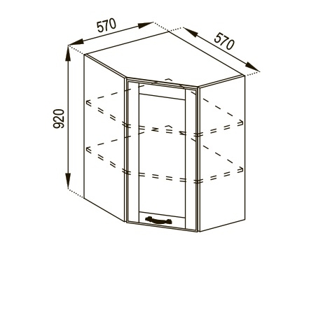 Навісна шафка В57x57 (h-920) кухня Домініка Світ Меблів елемент верхнього ярусу модульної кухні, який вигідно організує навіть невеликий простір і максимально оптимізує простір, раціонально допоможе використовувати важкодоступні ділянки кухонної зони і чудово підійде для зберігання предметів, доступ до яких повинен бути максимально швидким і зручним. Шафка верхня кутова містить одне закрите відділення з двома полицями всередині, оптимальний вибір для тих, кому потрібно багато місця для зберігання всього, що може знадобитися в процесі приготування. Корпус виготовляється з якісного ламінованого ДСП у популярних кольорових рішеннях на вибір «білий», «дуб сонома», «графіт», «попелястий» та «дуб крафт золотий» з фасадами із МДФ у кольорових рішеннях на вибір «аквамарин темний», «сірий оксамит» та «білий шовк». Кухня Домініка Світ Меблів допоможе створити ідеальний варіант для Вашого інтер'єру.