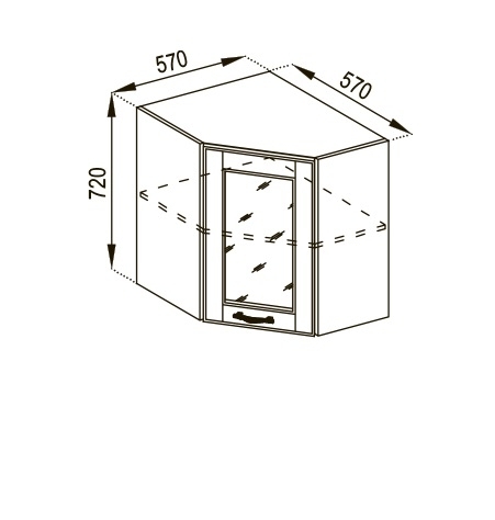 Верхня кухонна шафка В57x57Ск ДСП кухня Марго Світ Меблів стане вигідним рішенням та створить у приміщенні досить гармонійний та оригінальний дизайн, при цьому простір кухні стане більш зручним, комфортним та практичним, що важливо для дизайну кухонного простору. Шафка верхня кутова нагадує вітрину і містить одне закрите відділення з полицею всередині, де зручно можна розмістити різні декоративні елементи, сервізи або просто посуд. Корпус виготовляється з якісного ламінованого ДСП у популярних кольорових рішеннях на вибір «білий», «дуб сонома», «графіт», «попелястий» та «дуб крафт золотий» з фасадами із МДФ у кольорових рішеннях на вибір «арабіка», «елегантний сірий софт тач», «інжир», «лаванда софт тач», «каталонський жовтий», «світло-сірий софт тач», «світлий какао», «темний хакі», «сапфір східний», «чорний софт тач», «білий супермат», «сірий софт тач» , «дерево трансильванія», «світло-сіра текстура супермат», «блакитна лагуна», «графіт». Кухня Марго Світ Меблів - чарівна, дозволить Вам максимально комфортно і зручно спланувати приміщення, створивши по-справжньому невимушене оточення наповнене приємними емоціями.