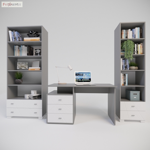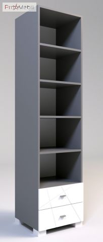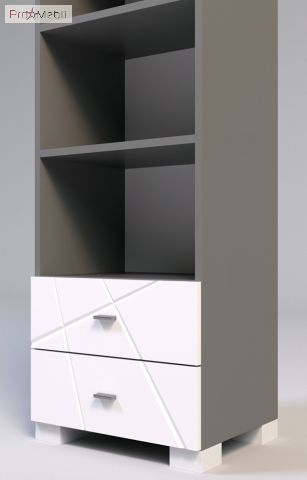 Місткий відкритий стелаж Х-43 X-Скаут Санті для дитячої, вітальні або домашнього кабінету. Зверху має відділення з полицями, знизу дві висувні шухляди. Зручний ряд полиць забезпечує простий і безперешкодний доступ до вмісту стелажа. На полицях з легкістю розміститься велика кількість книг, папок і журналів. Корпус виготовляється з високоякісного ДСП товщиною 18 мм австрійського виробника «EGGER», фасади - МДФ c фрезеруванням товщиною 16 мм виробництва Італія. Торці деталей обклеюються кромкою ПВХ фірми Rehau. Меблі X-Скаут Santi випускаються в контрастному поєднанні «сірого матового» корпусу з «білими матовими» фасадами. Характерними особливостями меблів X-Skaut Santi є сучасний дизайн, прості геометричні форми модулів, елегантне фрезерування на фасадах, стильні довгасті пластикові ручки, фірмові комплектуючі німецького виробника Hettich і телескопічні направляючі повного висунення. Меблі X-Скаут Санті це спосіб унікального аранжування інтер'єру дитячої кімнати, в якій Ви створите унікальний, наповнений легкістю лофт-інтер'єр.