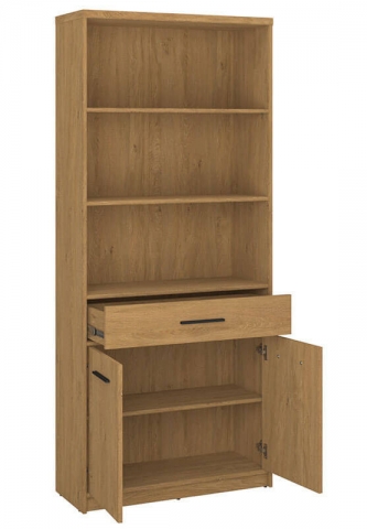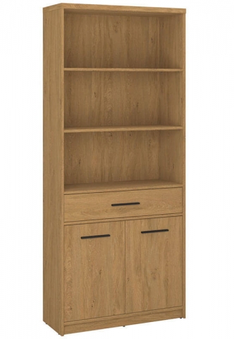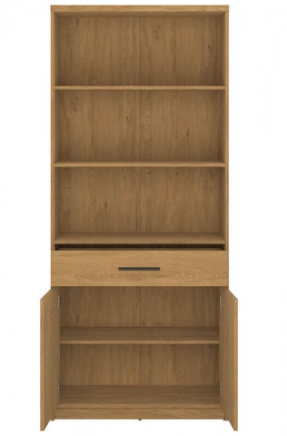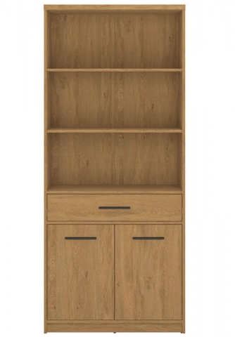 Стелаж відкритий 2D1S/84 Паві ВМВ, який зачарує любителів природної елегантності та універсальності, створивши витончене оточення у вітальні, спальні, молодіжній кімнаті, кабінеті та навіть у передпокої. Стелаж містить одну висувну шухляду, три відкриті та одне закрите відділення за двома дверима з полицею всередині. Меблі привертають увагу унікальним стилем; привабливим теплим відтінком «дуб кам'яний» із чіткою дерев'яною текстурою; простотою геометричних форм; потовщеними масивними боковинами та стільницями; контрастними подовженими пластиковими ручками чорного кольору; стійкими ніжками; фірмовими комплектуючими. Pavi VMV чудовий вибір для людей, які хочуть створити затишну та стильну атмосферу у своєму будинку.
