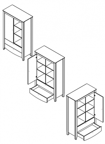 стелаж містить три відкриті ніші, дві висувні шухляди та закрите відділення з двома полицями всередині |