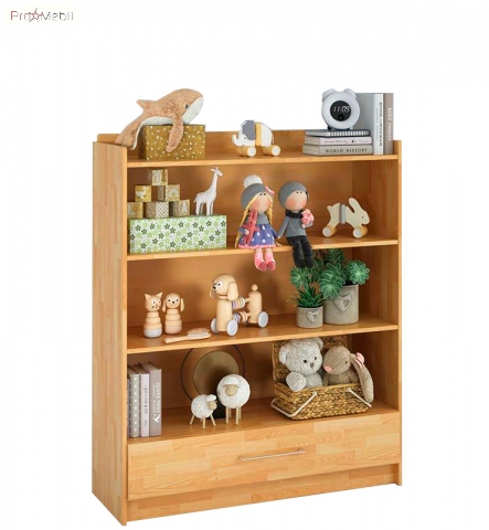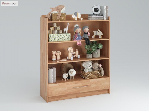 Стелаж з шухлядою Whity Клен вдало поєднує в собі функціональність і сміливий дизайн. Стелаж з шухлядою ідеально підходить для зберігання дрібних предметів, таких як книги та іграшки. Якщо є зайвий простір, ви можете додати свій власний творчий штрих і прикрасити полиці барвистими предметами або невеликими вазонами з кімнатними квітами. Стелаж містить дві полиці, які разом з корпусом утворюють чотири секції для зберігання та одну висувну скриньку. Корпус та фасадні частини виготовляються із сертифікованої FSC натуральної деревини - бук, відшліфованої до гладкої поверхні та покритої лляною олією виробника KNEHO. Гарні та сучасні, затишні та міцні, екологічно чисті та натуральні дитячі меблі Whity Клен – ось правильний вибір на користь здоров'я, безпеки та сучасного стилю інтер'єру найважливішої кімнати вашої квартири.