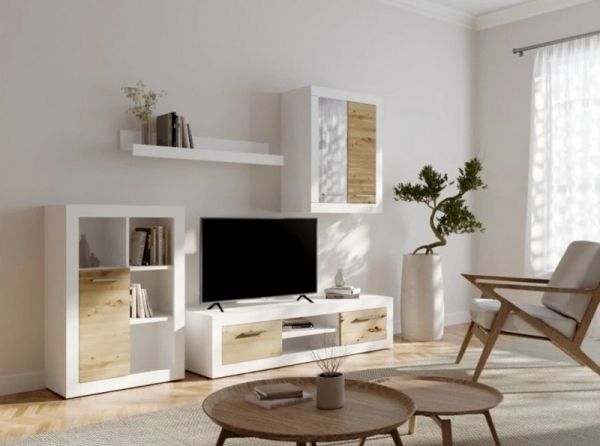 Стінка Шакіра ВМК – Україна (БРВ) – легкий та ненав'язливий набір меблів у вітальню від української фабрики ВМК – Україна. Корпус та фасадні частини виготовляються з ламінованого ДСП з натуральним відтінком дерева «дуб артизан» з ідеально білим «німфея альба». Стінка вражає своїм сучасним дизайном; практичністю, функціональністю та гарною місткістю; ідеальним поєднанням; ефектним підсвічуванням; довгастими ручками, сріблястого кольору.