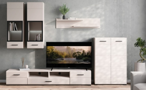 Стінка Арктика ВМК – Україна (БРВ) - сучасна стильна вітальня у стилі мінімалізм українського виробника ВМК - Україна. Головні особливості - прості прямокутні форми та модульна конструкція. Стінка випускається у кольорі кашемір, візуально розділеними на блоки. Корпус виготовлений із ламінованого ДСП, фасад - із МДФ, вітрини з прозорим тонованим склом. Ручки виконані із пластику чорного кольору довгастої форми. Вітальня Арктика ВМК – Україна (БРВ) має модульну конструкцію, де всі елементи окремо стоять і за бажання їх можна переставляти місцями.