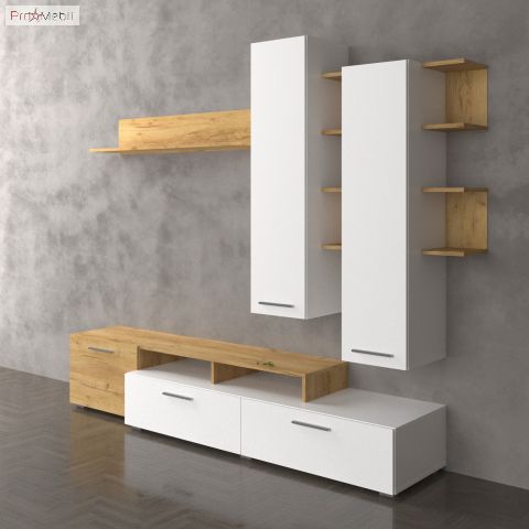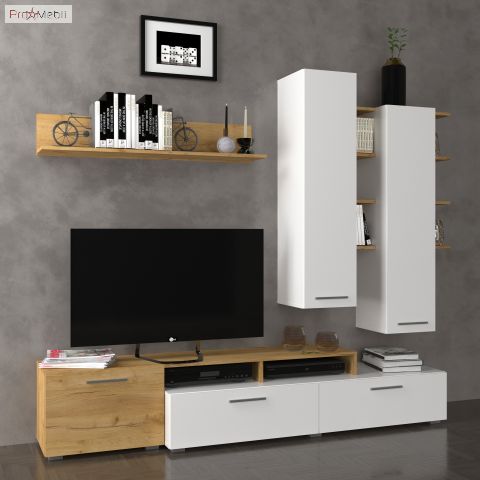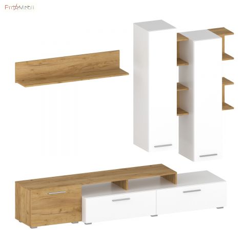 Стенка Astin VMV (Астин ВМВ) - это оригинальная стенка-гостиная производства фабрики ВМВ Холдинг, станет отличным дополнением гостиной комнаты. Стенка выпускается в сочетании цветов белого и теплого оттенка древесины, и благодаря такому сочетанию выглядит уютно и стильно одновременно. Корпус и фасады изготовлены из ламинированного ДСП толщиной 16 мм фабрики Kronospan. Гостиная Астин VMV продается цельной конструкцией и состоит из следующих элементов: тумба под телевизор с закрытыми и открытыми отделениями, навесные шкафчики позволит скрыть необходимые вещи для хранения и навесной полки над тумбой ТВ для размещения и хранения различных вещей. Коллекция Astin VMV характеризуется асимметричным размещением, продолговатыми ручками серебристого цвета, аккуратными ножками и качественной и функциональной фурнитурой HAFELE, которая очень удобна в использовании. Гарнитур Астин ВМВ станет идеальным дизайнерским решением, для обустройства гостиной комнаты. Купить стенку Астин VMV можно в нашем интернет-магазине ProMebli.ua с доставкой по всей Украине. Оплата за наличный и безналичный расчет, в кредит и рассрочку.