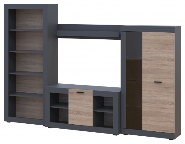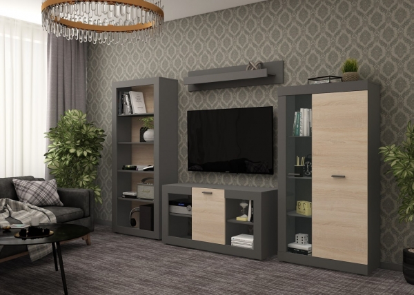 Стінка Дана 1Д ЕВШВ Doros – витончений та універсальний набір меблів, допоможе створити простір, який буде візуально привабливим та зручним для всіх, хто відвідує вітальню. Меблі виготовляються з ламінованого ДСП (Kronospan) товщиною 16 мм у поєднанні протилежних відтінків: елегантного та загадкового кольору "графіт" з теплим та заспокійливим відтінком деревної текстури "дуб сонома". Торцеві поверхні облицьовані кромкою ПВХ товщиною 0,5 мм / 2 мм. Колекція привертає увагу: елегантністю та вишуканістю; мінімалістичним підходом із чистими лініями; поєднанням різних текстур, створюючи привабливий та непередбачуваний образ; пластиковими довгастими ручками; фірмовими комплектуючими: петлями та роликовими напрямними. У комплекті передбачені всі необхідні елементи, а це: ТВ тумба; вітрина, яка має дверцята із вставкою із прозорого загартованого скла; місткий стелаж, а також навісна поличка. Всі елементи є самостійними, тому Ви зможете розставити їх у кімнаті на ваш смак, створюючи нові та незвичайні ідеї. Модульні меблі Дана Doros поєднує різні елементи, створюючи унікальний та неповторний інтер'єр. Купити меблі Дана Doros можна у нашому інтернет-магазині ProMebli.ua з доставкою по всій Україні. Оплата за готівковий та безготівковий розрахунок, у кредит, розстрочку чи оплату частинами від ПриватБанк.