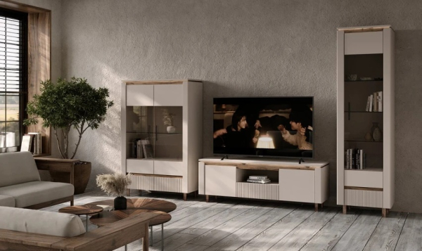 Стінка Елегант ВМК – Україна (БРВ) – втілення сучасного затишку і стриманої елегантності, створене для тих, хто цінує стиль, комфорт і функціональність в кожній деталі. М'який відтінок фасадів «кашемір» гармонійно поєднується з теплою деревною текстурою «дуб ліворно», створюючи атмосферу спокою і респектабельності. Чіткі прямокутні форми, виразні вертикальні акценти на фасадах підкреслюють сучасний характер меблів, а вітрини з прозорим тонованим склом додають легкості та витонченості. Відсутність традиційних ручок надає стінці атмосферу стриманої елегантності, а фрезеровані виїмки на фасадах з контрастними декоративними планками стають виразними стильними акцентами. Високі стійкі ніжки забезпечують надійну стійкість конструкції, а використання фірмових комплектуючих гарантує плавність ходу і легкість в щоденній експлуатації.