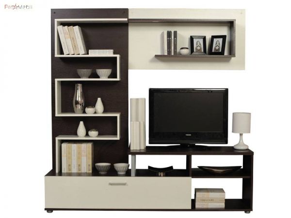Мини стенка для гостиной Jasmin VMV (Жасмин ВМВ) украинской фабрики VMV. Асимметричная модель с контрастным сочетанием цветов являются изюминкой данной гостиной. Корпус и фасад изготовлены из ДСП наивысшего качества. Конструкционно стенка представляет собой открытые зигзагообразные полки, закрытый ящик, который открывается на себя и тумбу под телевизор.