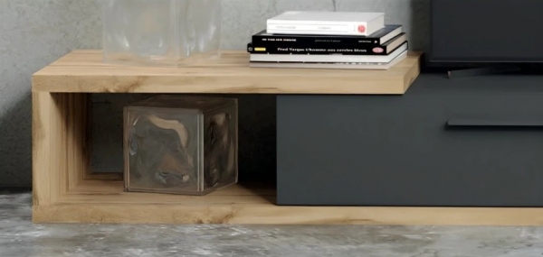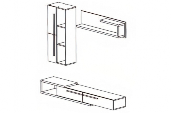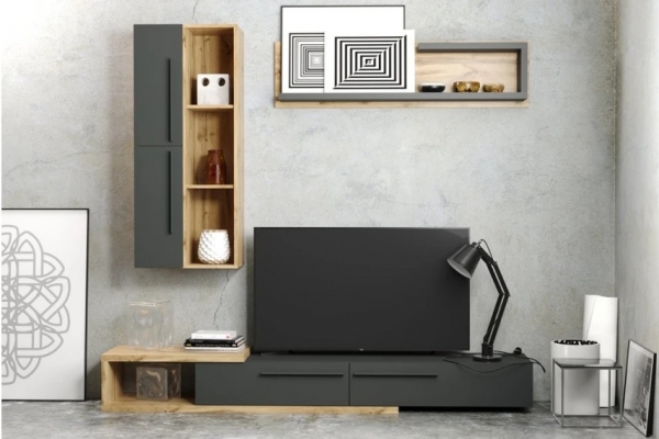 Стінка Кальвадос Гербор – меблевий комплект в сучасному рішенні від української меблевої фабрики Gerbor – холдинг для облаштування інтер'єру вітальні. Корпус і фасади виготовляються з якісного ламінованого ДСП, у поєднанні кольорів «дуб тахо / антрацит». Меблі Кальвадос Gerbor характеризуються сучасним дизайном; незвичайним поєднанням кольорів; гарною текстурою; геометрично чіткими лініями; зручними плоскими ручками.