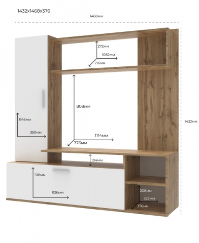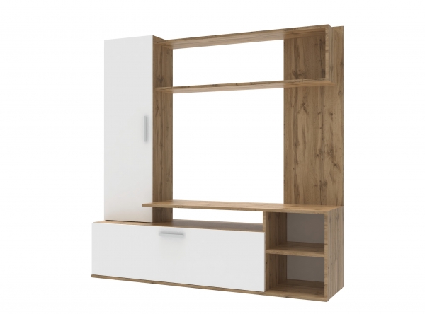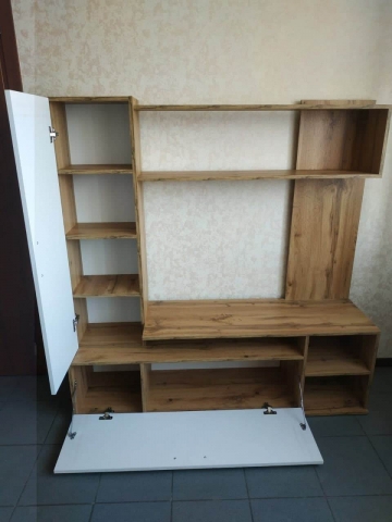 стінка представлена цілісною конструкцією та складається зі: закритого стелажу з полицями, тумби під телевізор з відкидною дверцею та відкритої полиці |