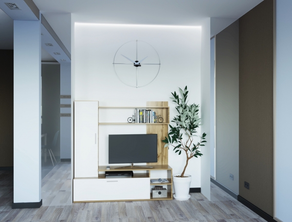 Елегантна та мінімалістична стінка Кона Doros допоможе облаштувати вітальню комфортно та ідеально. Стінка у вітальню представлена цільною конструкцією і складається з: закритого стелажу з полицями, тумби під телевізор з відкидною дверцею та відкритої полиці. Сучасна стінка Кона Doros - це чудовий спосіб витончено та комфортно облаштувати будинок, урізноманітнити інтер'єр, розмістити зручно всі речі та необхідну техніку.